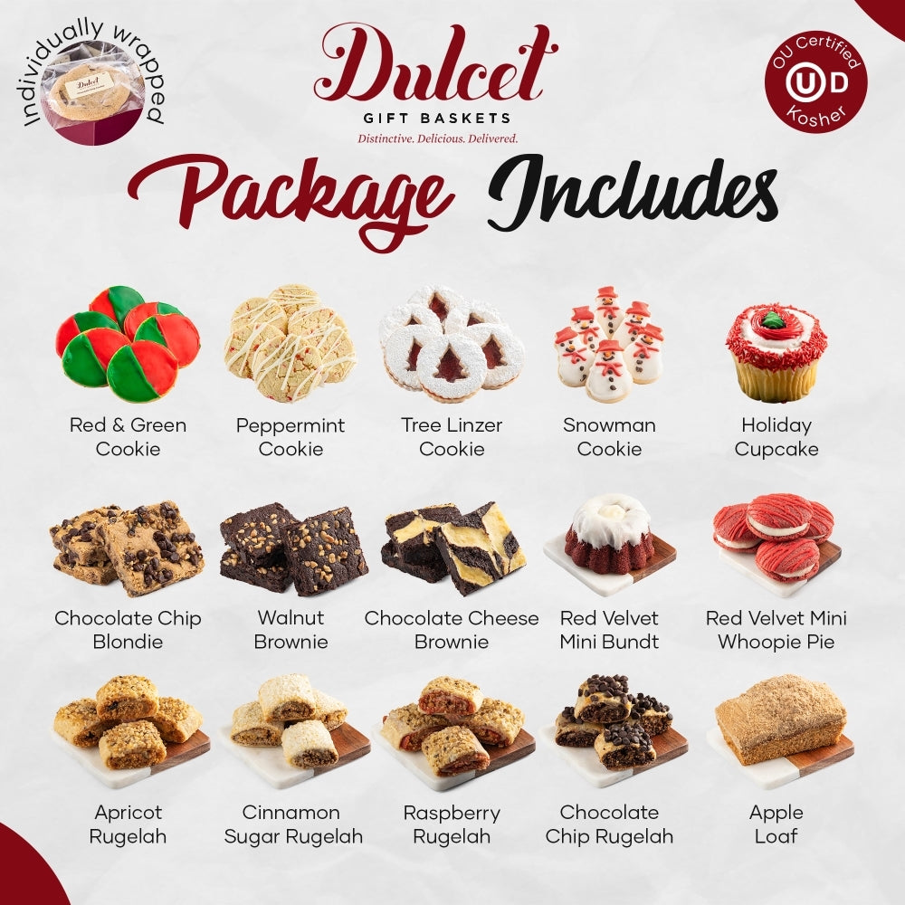 This gourmet gift basket will enlighten hearts and lift spirits, just in time for the holidays. With a promise to make your holiday special in every way, Dulcet guarantees freshness in the red velvet whoopie pies, Christmas-themed cookies, and fudgy brownies.