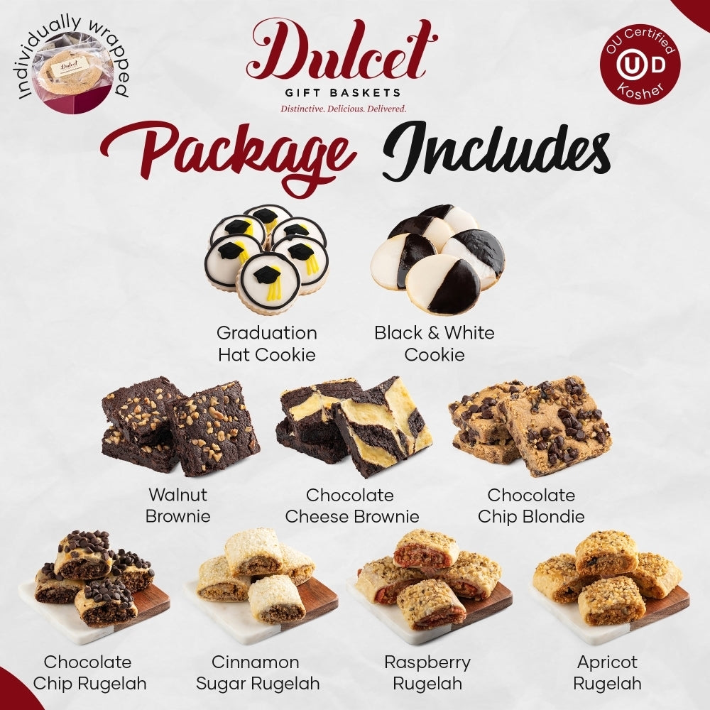 Bursting with unique flavors, each intricately hand-designed treat will score a perfect hit with any sweet tooth and delight your recipient. Charming graduation hats alongside mini black and whites are also included in this basket.
