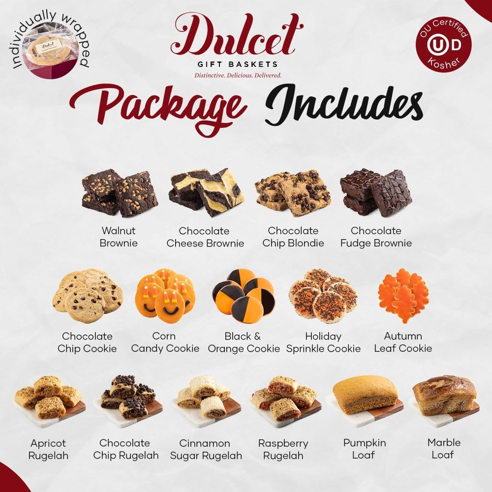 Go big on your Halloween gifting! Combining freshness and taste is a ‘tall order’, but Dulcet has come through with flying colors once again. TWO signature cardboard Gift Boxes piled onto each other are filled with holiday-inspired baked goodies like rustic pumpkin loaves, cinnamon-flavored cookies, and orange and black cookie rounds.