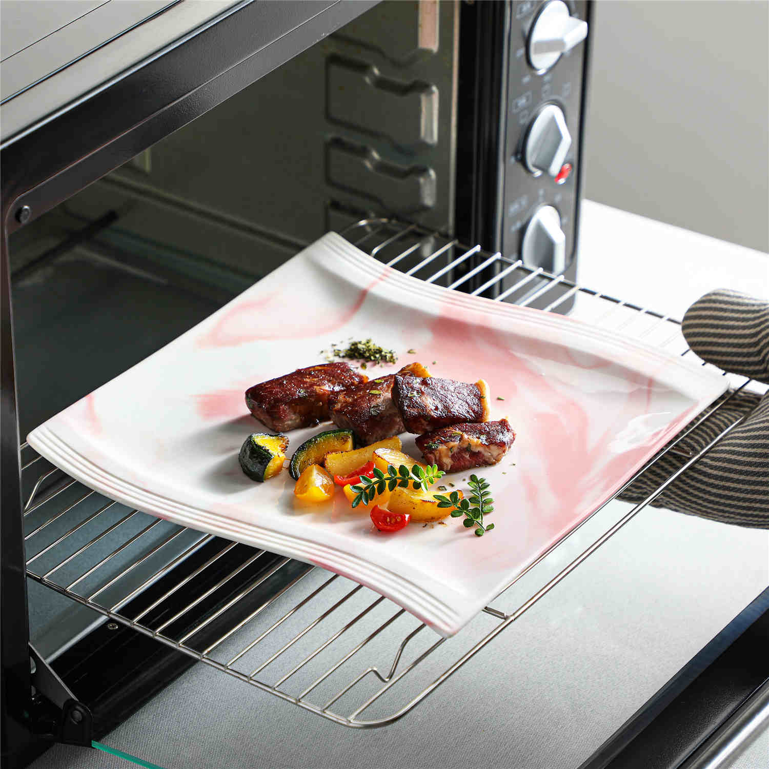 The Flora 30-Piece Dinnerware Set blends modern design with practical versatility, showcasing a wave-edge silhouette and sleek geometric patterns. Crafted from durable porcelain, it serves six with dinner plates, salad plates, soup plates, cups, and saucers. Available in ivory white or marble-inspired grey, blue, and pink, it brings understated elegance to everyday meals and special occasions. Microwave, oven, and dishwasher safe, this set ensures both convenience and long-lasting style.